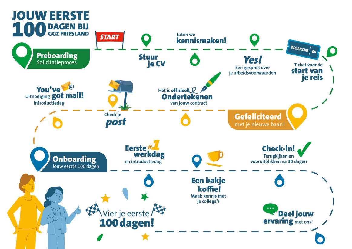 Bij GGZ Friesland geloven we dat een goede start het verschil maakt. Daarom hebben we een speciaal onboardingsprogramma ontwikkeld dat jou in je eerste 100 dagen begeleidt, ondersteunt en inspireert. Of je nu nog aan het oriënteren bent of binnenkort begint: hier krijg je alvast een kijkje in hoe jouw eerste 100 dagen bij GGZ Friesland eruitzien.